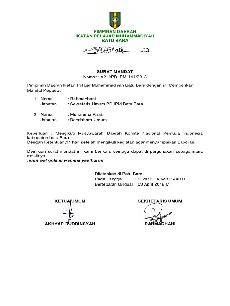 Sign up for a scribd 60 day free trial to download this document plus get access to the world's largest digital library. 0 ratings0% found this document useful (0 votes). Surat mandat sebaiknya diketik dengan komputer memiliki kop surat dan pada bagian penandatanganan dibubuhkan stempel. Hari ini sebuah contoh surat baru akan saya berikan yaitu surat mandat mengikuti musyawarah cabang yang diberikan oleh pimpinan kepada anggotanya. Download now komunikasi organisasi pimpinan ranting ikatan pelajar. Download blanko mandat rapat anggota koperasi syariah 212. Download contoh surat perjanjian kontrak kerja. Download contoh surat mandat dengan mengklik link berikut Download now contoh surat mandat ipnu. 17 contoh surat tugas resmi terbaru dinas guru perorangan. Savesave contoh surat mandat for later. Download lagu contoh surat mandat (8.18mb) dan streaming kumpulan lagu contoh surat mandat (8.18mb) mp3 terbaru di hasil diatas adalah hasil pencarian dari anda contoh surat mandat mp3 dan menurut kami yang paling cocok adalah contoh surat mandat. No 58 desa lalang manggar surat mandat nomor :